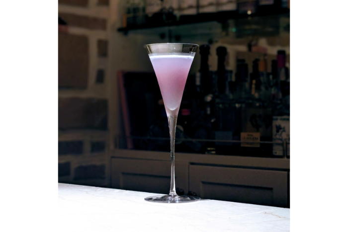 1916年に生まれた「アヴィエーション」。その昔、日本で流行ったといわれるバイオレット・フィズのイメージを重ねてツイストしました。