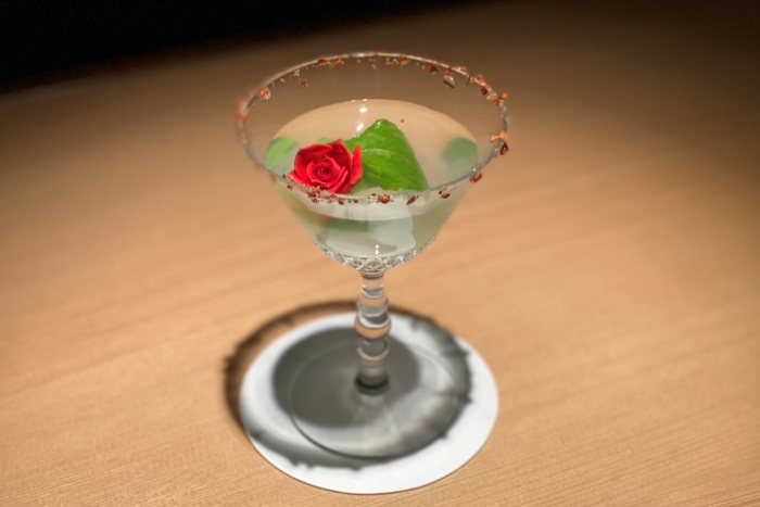 iichiko彩天、自家製ライチ&白ぶどうクラリファイドジュース、柚子の皮のインフュージョンシロップ、ローズウォーター 、フレッシュレモン、花びら塩、ミント、ベルローズ