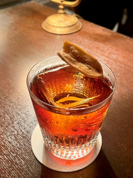 ブッシュミルズ 10年、オーストリア産ダークチョコレートリキュール、フランス産バナナリキュール、国産山椒スピリッツ、バナナチップ、金粉