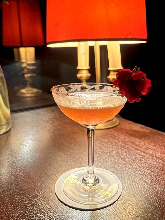 パトロン シルバー、フランス産ルバーブリキュール、フレッシュライムジュース、ラズベリーシロップ、エディブルフラワー、ストロベリーソルト