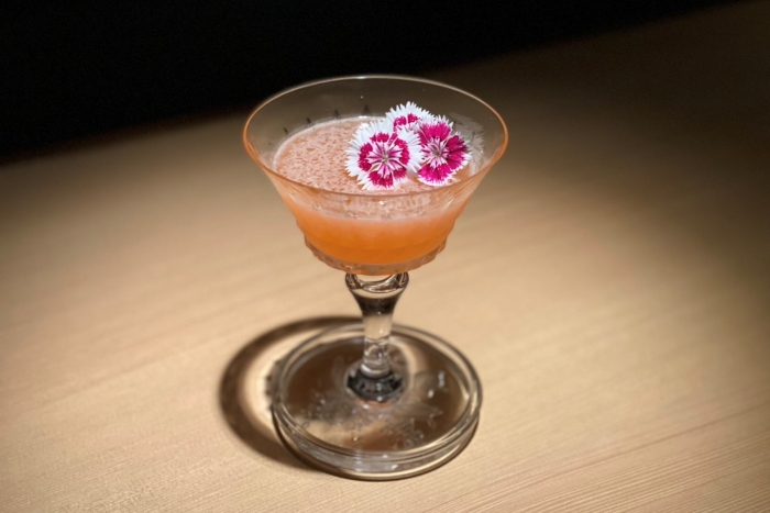 パトロン シルバー、フランス産パッションフルーツリキュール、オレンジジュース、レモン、エディブルフラワー