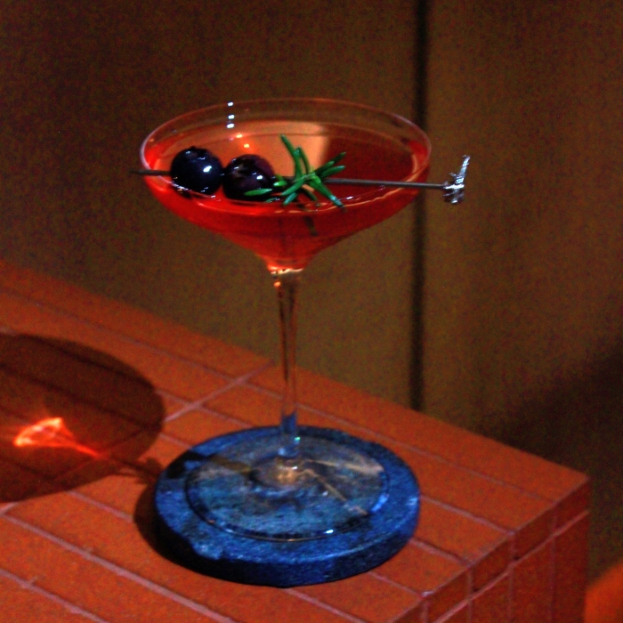 ブルーベリー インフューズド ブッシュミルズ ブラックブッシュ、アイリッシュウイスキーリキュール、マデイラ ミディアムドライ、レモンジュース、スパイスハニー漬けブルーベリー&ローズマリー