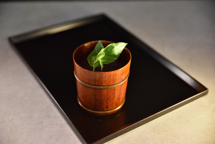 iichiko彩天、セミドライトマト インフューズド TUMUGI、自家製 ミネストローネ上澄み液、自家製 玉ねぎピュアシロップ、ベルモット ビアンコ、プロセッコ DOC、バジルの葉