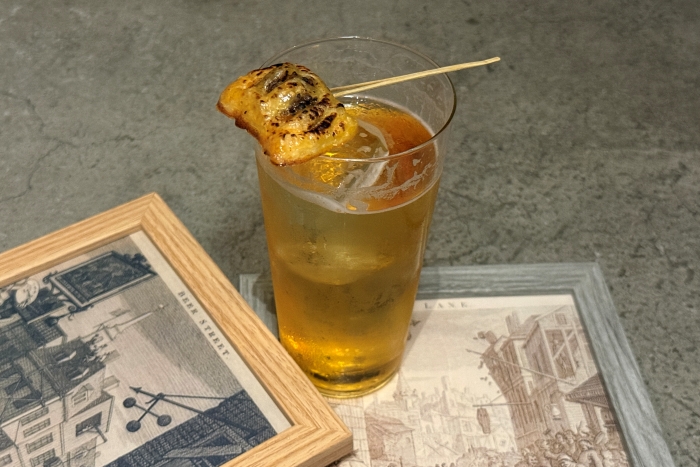 ブッシュミルズ 10年、レモンジュース、ノンアルコールビール、自家製ジュニパーベリーシロップ、ジュニパーミートパイ