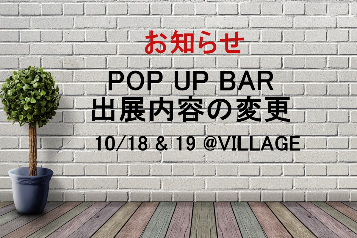 10月18日(土)・19日(日)開催の「VILLAGE」POP UP BARに関する変更のお知らせです。