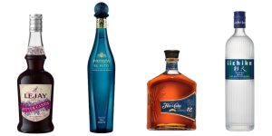 (左から、ルジェ ビター カシス、パトロン EL ALTO、フロール・デ・カーニャ 12年、iichiko彩天) -